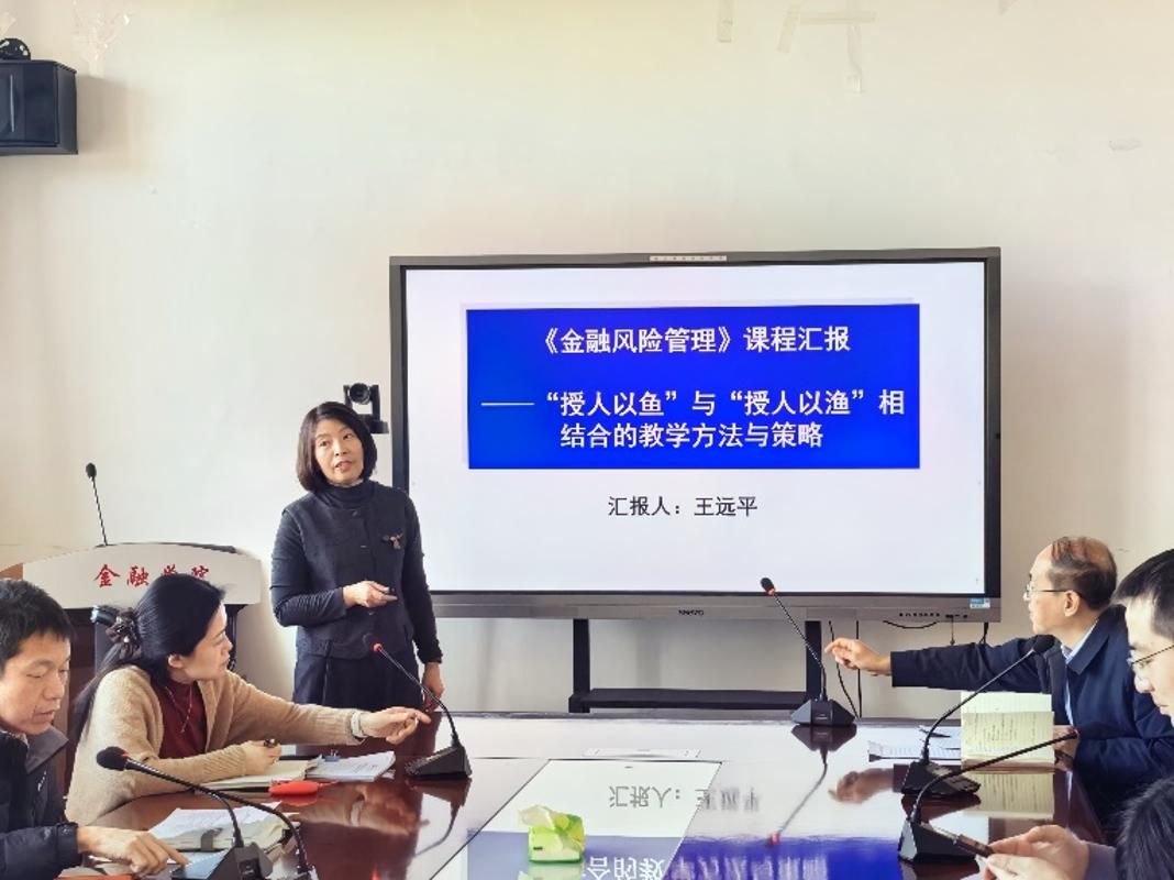 2025年12月23日下午,金融学院举办了集体备课汇报交流活动。王远平老师代表《金融风险管理》课程教学团队,以“‘授人以鱼’与‘授人以渔’相结合的教学方法与策略”为主题,汇报了《金融风险管理》课程的教学探索和实践情况。